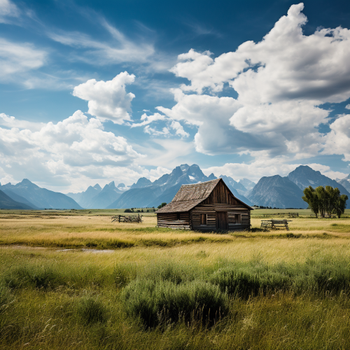 Realistic image of a log cabin on a mountain trail with a horse tied to a post outside. Lush green meadows and a distant waterfall are visible in the background.