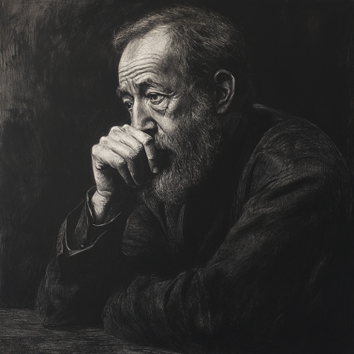 a charcoal portrait of legendary Russian author Aleksandr Solzhenitsyn sitting gazing into the distance deep in thought. The atmosphere around him is dark and melancholic. Powerful. Emotional. Realistic. Detailed. Stoic.