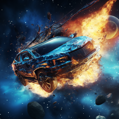 A car flipped upside down, floating in space with earth in background, on fire with blue flames