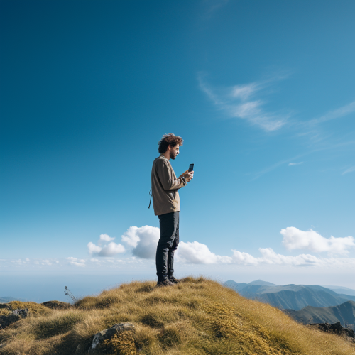 man holding phone, shot from far, in a mountain, blue sky, side photo shoot, raw photo