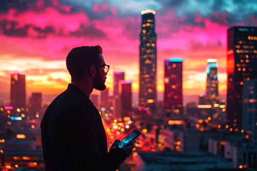 A stylish, determined man in his late 30s, standing on a rooftop with the bright lights of Los Angeles behind him, his face filled with resolve, holding a phone in one hand. The skyline glows under a vibrant sunset, showcasing tall buildings and neon signs --ar 3:2