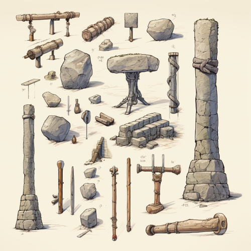 orthographic drawings of prop designs of a highland games athletic equipment, caber, weight for distance, hammer throw, sheaf toss, stone throw, from 11th century Scotland in graphic novel style of Studio Ghibli