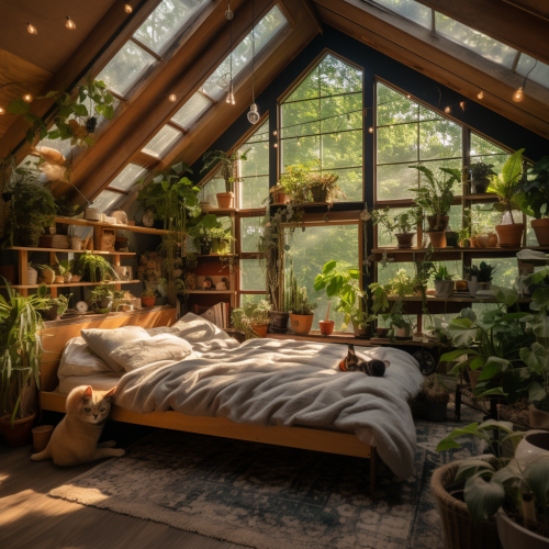 small barn converted to bedroom, lots of natural light, plants, modern country style, cozy, fairy lights, cats