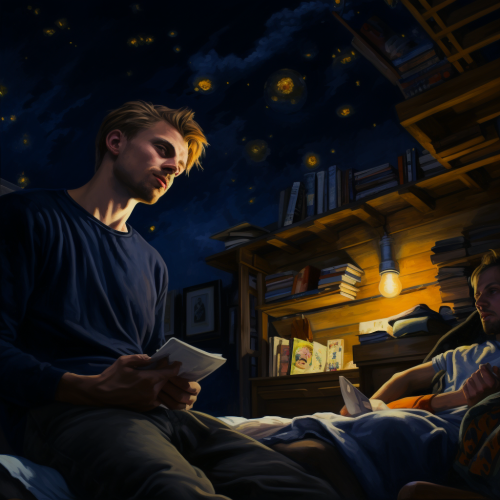 Dark blue night lighting. View from below on a lonely bright yellow star on the ceiling. A man with very short blond hair sleeping in a bed. Another man with hair in a brown bun drinking a glass of whiskey. bedroom with a nightstand, books and a blue carpet. Wood door.--ar 2:3 --version 5.2