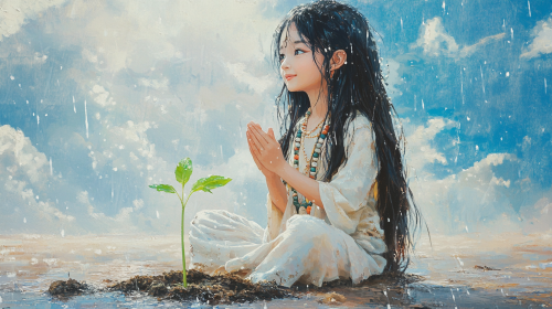 A 10-year-old Korean girl bodhisattva, standing calmly in a quiet, dark dreamlike setting. She wears a soft, modest ivory sweater and beige wool skirt, with her hands gently clasped. Her serene expression reflects wisdom beyond her years. The background is mystical and surreal, with shadowy tones of deep blues and purples swirling softly. The atmosphere feels ethereal and otherworldly, yet peaceful, matching the quiet flow of soft rap music. Her long black hair flows gently in the breeze, blending into the dreamlike scene dark and subdued, yet captivating. 4k resolution, --ar 16:9