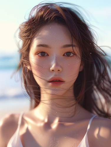 A hyper-realistic close-up portrait of a young Korean woman with flawless, smooth skin, standing in front of a serene beach with soft waves and a clear blue sky. Her face is illuminated by gentle, natural sunlight, creating a subtle, radiant glow on her skin. She has slightly almond-shaped eyes with a calm and soft expression, and her lips are naturally full with a hint of a gentle smile, giving her a warm, approachable look. Her long, dark brown hair is styled smoothly and tucked behind her ears, allowing her face to be fully visible, with a few strands adding a casual elegance. She is wearing a minimalist white sleeveless top with thin straps, emphasizing her clean, sophisticated style. The background captures a blurred, sunlit beach scene with a pale blue sky, white sand, and the ocean’s horizon, adding a refreshing and summery atmosphere to the image. The lighting is soft yet bright, highlighting her skin’s natural texture and giving the scene a warm, sun-kissed effect. There’s a slight breeze that gives her hair a natural flow, enhancing the relaxed and effortless feel of the portrait. Ultra-high-definition quality, capturing every delicate detail with photorealistic precision, creating a tranquil and elegant beachside portrait --ar 3:4 --v 6.0