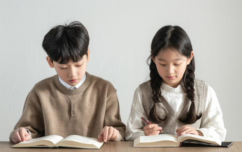 A detailed, realistic image of two Korean middle school students, a boy and a girl, engrossed in studying English against a plain white wallpaper background. The simplicity of the background emphasizes their focused and determined expressions. Soft, natural light enhances the scene, creating a calm and focused atmosphere --ar 8:5 --v 6.0