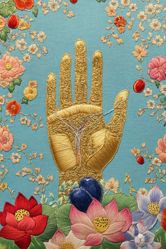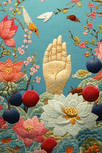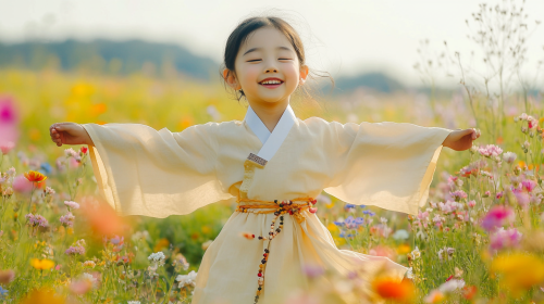 A 10-year-old Korean girl, dressed as a young monk, dancing joyfully in a field of flowers. Her eyes are closed, and she has a serene, content expression on her face. She wears prayer beads on her wrist. The background is filled with a beautiful array of colorful flowers under a bright, clear sky. --ar 16:9