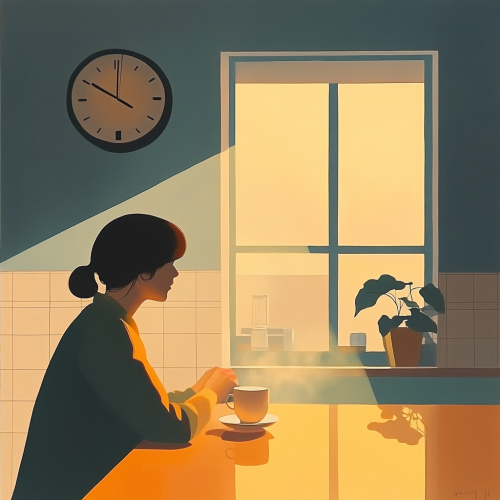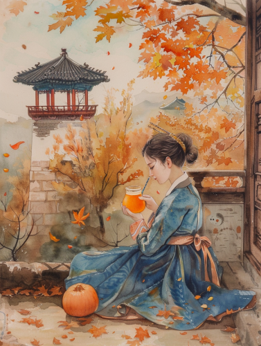 Illustration of a 10-year-old Korean girl bodhisattva in a calm, atmospheric scene. The girl wears an ivory sweater and a soft beige wool skirt, standing peacefully with a gentle smile. Her long black hair softly sways in the wind. The background is dreamy and slightly surreal, with muted, dark blues and purples to create a mysterious yet serene ambiance. The illustration has a subtle, ethereal glow, matching the flow of quiet rap music, with soft shadows and a peaceful, comforting vibe--beautiful but not too dark or frightening. 4k resolution, --ar 16:9