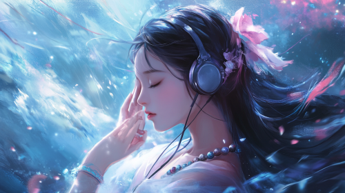 "A dreamy, fairytale-like illustration of a 15-year-old Korean girl bodhisattva, shown in a side profile. She is deeply immersed in the music, wearing a modern headset over her ears, with both hands gently holding the headset. Her eyes are closed, and her expression is calm and focused. Her sleek, black hair flows softly in the breeze, styled in a trendy, youthful way. A string of prayer beads rests on one wrist. The background is a surreal, otherworldly scene with soft pastel colors blending into deep blues and purples, creating a mystical, dreamlike sky. Light particles and subtle glowing elements float around her, giving the scene a peaceful, healing energy. The atmosphere is magical and serene, inviting viewers to feel calm and inspired. 4k resolution, --ar 16:9