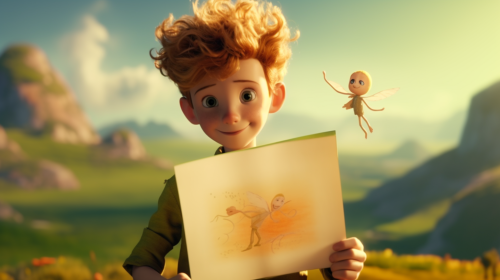 The little prince laughing as he holds up a drawing. He asks for a drawing of a sheep. The pilot is drawing with serious concentration, while the little prince is full of excitement. Pixar style animation, bright colors, expressive characters --ar 16:9 --v 5.2 --style raw