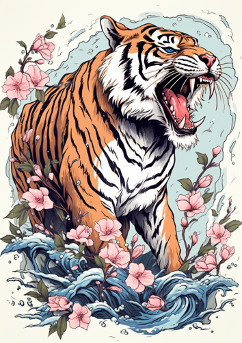 neo-traditional, thin line drawing illustration of a tiger, full body, profile position, old oriental Japan style, aggressive, screaming, running, climbing with vibrant colors and surrounded by flowers for tattoo design, powerful , impressive, feminine --ar 5:7