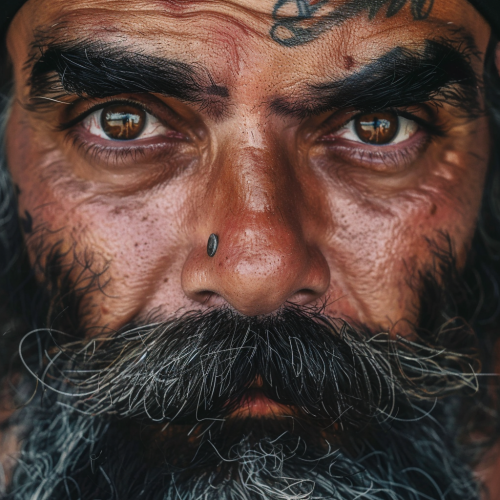 imagem realista de um homem ruivo com topete na frente e raspado dos lados. Tem olhos castanhos nariz com ponta arredondada e laterais redondas, queixo e maxilar quadrados, lábios finos, com o semblante sério e tatuagem na lateral da cabeça