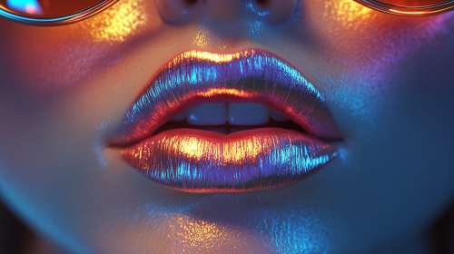 A shiny silver tongue out, white woman with sunglasses, close-up portrait of lips, tongue sticking out of the mouth, colorful accents, high resolution, highly detailed, 3D rendering --ar 16:9 --v 6.1 --s 750