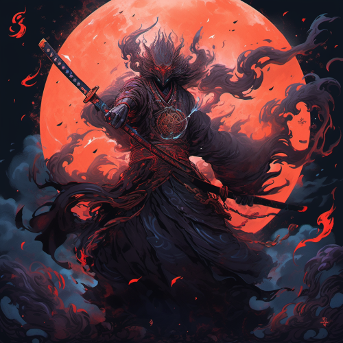 Grimdark mystic ominous sensei bushi wielding a huge vorpal knife, anime style, high fantasy, digital art, masterpiece painting, ultra detailed, ultra high definition, 8K resolution, 3D shading, superior quality, cover illustration, complex design, luminous highlights, rich vibrant colours, hyperrealistic, meticulously hyper detailed, high contrast, artstation --niji 5