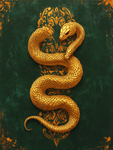 A stylized, heraldic emblem featuring a serpent, inspired by the house sigils from Game of Thrones. The design showcases a gold snake in a minimalist yet intricate pattern, set against a rich emerald green background. Emphasize clean lines and a symmetrical composition to evoke a regal and medieval European aesthetic. --ar 3:4 --s 750 --no realistic textures, no modern elements