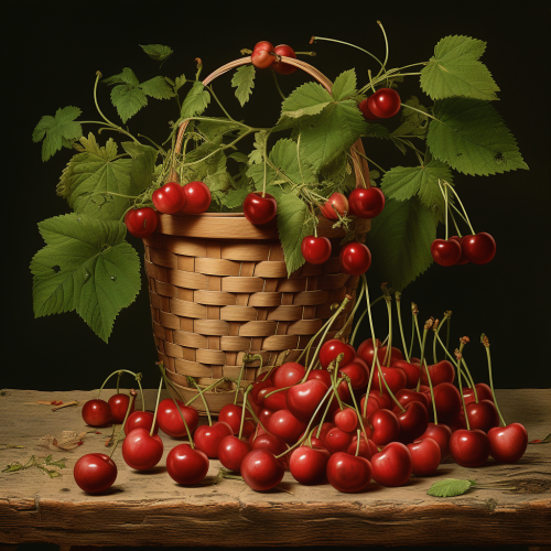 Create an extremely realistic image of a wall calendar featuring detailed and accurate depictions of cherries in different stages of ripeness. The calendar should be filled with images of tiny green cherries, medium-sized yellow ones, and large, fully ripe red cherries with a shiny surface, capturing the essence of their natural beauty. Place the calendar against an old-fashioned stone kitchen wall, enhancing the rustic charm. Adjacent to the calendar, set a vintage wooden crate brimming with freshly picked cherries of all colors, showcasing the diversity of their growth stages. Ensure that each day on the calendar includes a miniature illustration of a cherry corresponding to its typical stage of ripeness for that time.