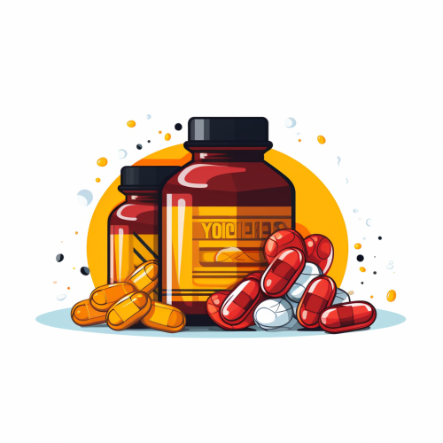 vector illustration, pablita style, yellow and red, gym supplements on a surface, white png background, svg
