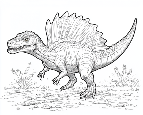 coloring page for kids, spinosaurus dinosaur, single object, minimalist, thick line, low detail, no shading --v 6.1 --style raw --stylize 175 --ar 5:4