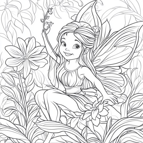coloring page for kids, Fairy of the Lily flower, cartoon style, thick lines, low detail, With the character in clear, defined lines, the background kept simple, Suitable for children aged 8 to 12 to color, no shading ,Dreamlike, the style of Norman Rockwell , Tim Burton film , 9:11