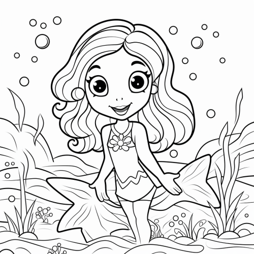coloring book page for kids, cartoon style, cute baby mermaid, simple black and white line art, black and white, thinner lines, line art, simple, simplistic, minimalist, plain, more details, white fill --no grey, shadow, shading, color -