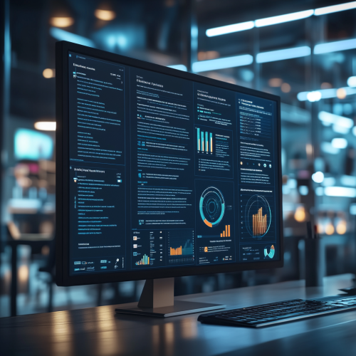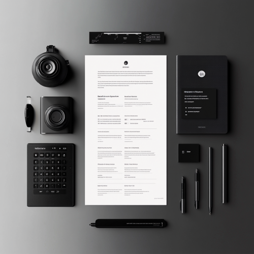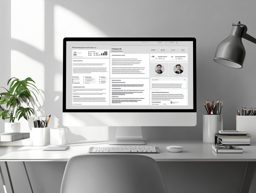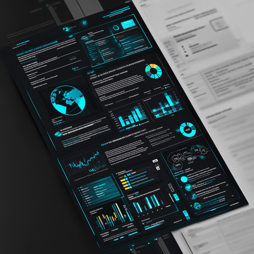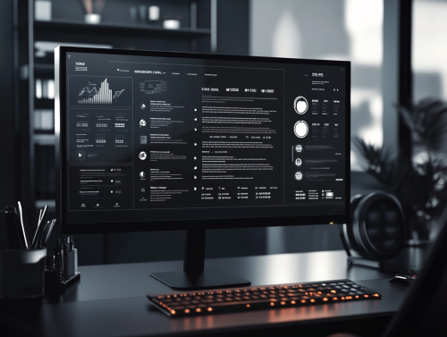 Generate a digital art for A digital art scene depicting a professional resume with key metrics highlighted. The background is a sleek, modern office setting with a focus on a computer screen displaying the resume. The color black is prominently featured, giving the scene a sophisticated and polished look. The resume on the screen has sections like 'Experience', 'Skills', and 'Achievements' with graphical representations such as charts and icons to emphasize key metrics. No text is written on the background. --ar 1:1