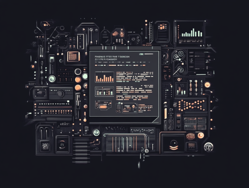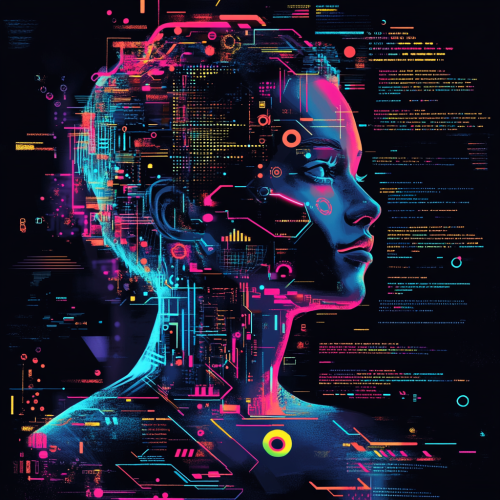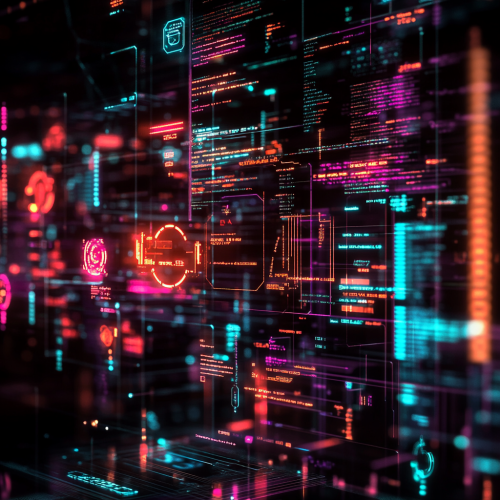 Generate a digital art for A digital art representation of a futuristic resume with top programming skills for 2024. The scene includes abstract elements like code snippets, algorithmic patterns, and tech icons. The background is predominantly black with accents of neon colors, creating a modern and high-tech atmosphere. No text is written on the background. --ar 1:1