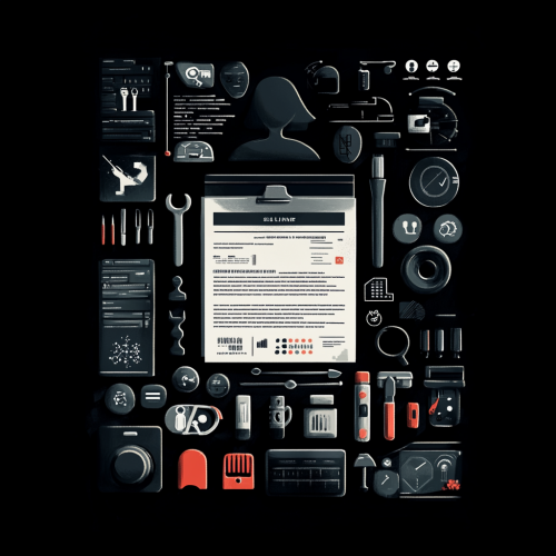 Generate a digital art for A digital art scene showing a person tailoring a resume with various tools and icons representing skills and experiences, set against a dark background. Use black color prominently. --ar 1:1