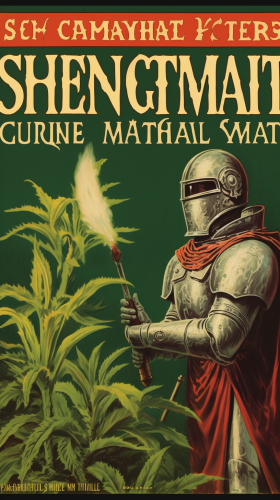 a 1940's style pulp science fiction magazine cover of a medeival knight growing weed --ar 9:16