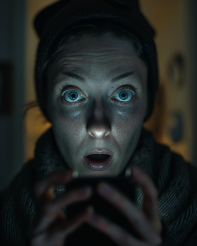 Front facing portrait of person staring at iPhone in horror, face illuminated by screen glow, wide-eyed expression of shock, mouth slightly open, instant of realization, candid emotional photography, cinematic lighting, 85mm lens, photorealistic --ar 4:5 --v 6.0