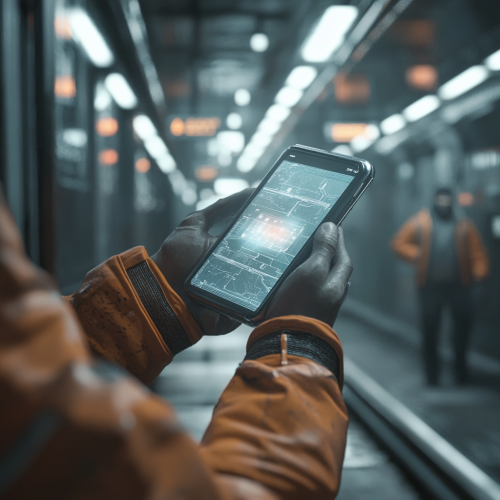 looking at left hand holding a mobile phone, facing screen, right hand out of shot, subway setting, rendered in the style of Alberto Mielgo, Entergalactic.