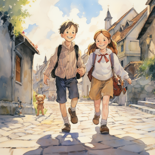 boy and girl aged ten, walking to school, smiling to camera, in Uderzo style
