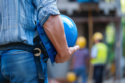 Man holding blue helmet close up. Construction man worker with office and people in background. Close up of a construction worker's hand holding working helmet. --ar 3:2 --v 6.0 --s 50
