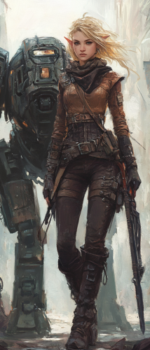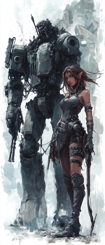 Female half-elf adventurer in leather armor, holding a crossbow, standing with her large mechanical construct companion. Dark Fantasy setting. The mood is ethereal. Watercolor art style with soft washes of color and fluid details. The background is a medieval city with some white space. --ar 3:7