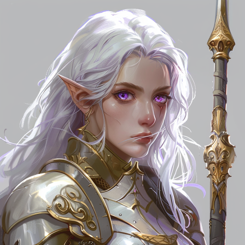 Fantasy Character Artstyle, female elf with purple eyes and white hair, cleric, gleaming silver armor, golden lance