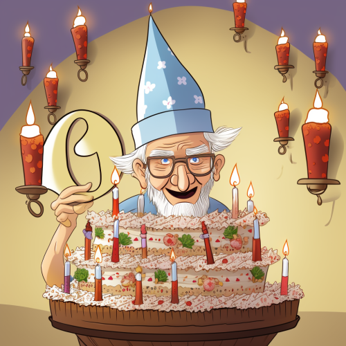colorful illustration with focus on an elderly smiling person, person is wearing party hat and holding a cake with 70 candles, wheelchairs in background
