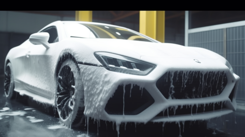 hispanic car wash attendants at a car wash detailing a sports car with soapy foam --ar 16:9 --v 5.0