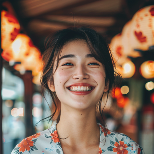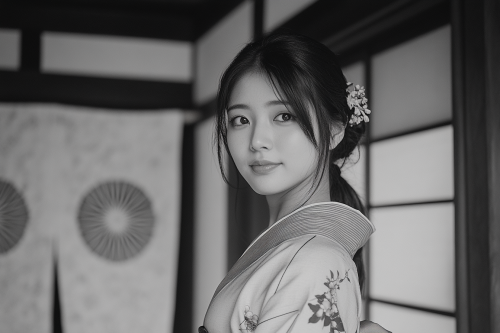 Photographed A beautiful Japanese woman in her 20s, a young landlady, wearing a plain kimono, standing with a slight smile in front of a Japanese-style building with noren curtains, shot by DSLR –s 750 --ar 3:2