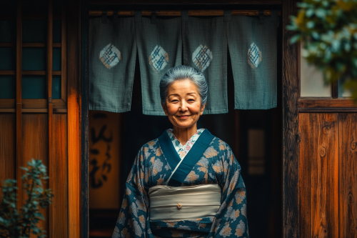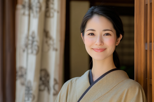 Photographed A beautiful Japanese woman in her 30s, the landlady, is wearing a plain kimono and is standing in front of a Japanese-style building with a noren curtain, smiling slightly, shot by DSLR –s 750 --ar 3:2