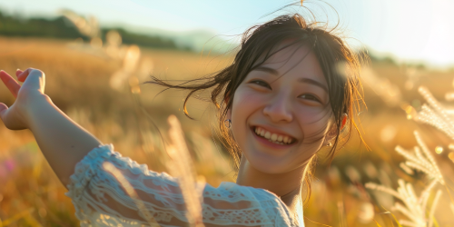 Woman playing in the meadows.Japanese teen mode.Smile. Full color photo.The resolution should be 30.4 megapixels, ISO sensitivity: 100, Shutter speed 1/2000 second. The image should be hyper-realistic, highly detailed, and high-resolution 16k. photogenic, --style raw --aspect 2:1 --v 6.0