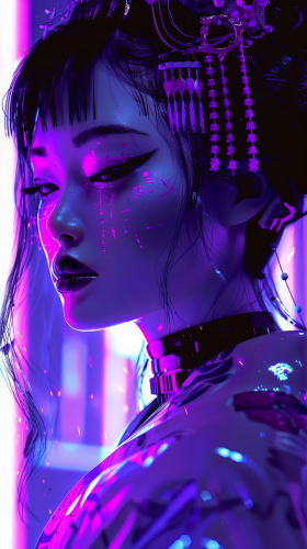 Cyber Geisha Girl, Cute, Japanese, Violet, Purple, white and black colours. --ar 9:16