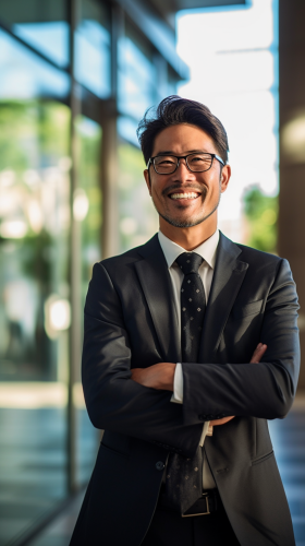 Portrait photograph. Generate an image of a smiling Japanese businessman in his 40s, with a pleasantly robust physique, wearing a suit and glasses. He stands at the entrance of a modern and stylish office building, utilizing the bright daylight and lighting. Illuminated by the sunlight streaming through the windows, he wears a joyful expression, radiating confidence and contentment. --ar 9:16 --v 5.1