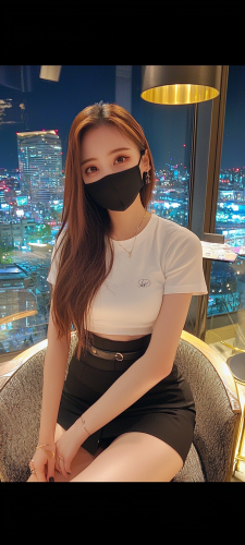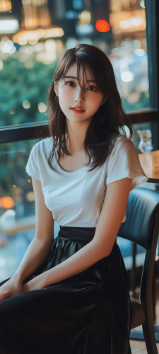 Japanese woman, face of a top TV personality, smiling, 26yo, perfect makeup, eyelash extensions, white T-shirt and long skirt, skirt has a deep slit up to the upper thighs, quads, beautiful combed hair, stylish cocktail, sitting on a chair, thighs and quads, shot from the front, stylish bar in the background, night view of Osaka from a high-rise floor from the window of a cafe, shot by a professional photographer with a high-performance luxury camera, --ar 9:20 --q 2 --v 6.1