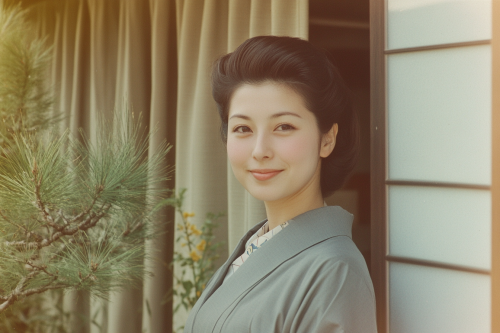Photographed A beautiful Japanese woman in her 30s, a young landlady, wearing a plain kimono, standing with a slight smile in front of a Japanese-style building with noren curtains, shot by DSLR –s 750 --ar 3:2