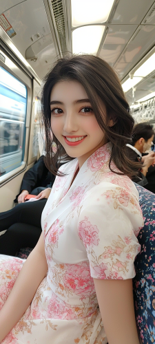 Japanese woman, top idol face, smiling, 18yo, eyelash extensions, white and pink dress, quads, beautiful combed hair, sitting on sofa, thighs quads, front view, Japanese train and passengers in background, professional photographer with high-end camera, --ar 9:20 --q 2 --v 6.1