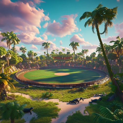 large, football field size, circular roller derby rink, outside, field is green, everglades,palm trees, oak trees with spanish moss, alligators, early evening, rendered in style of fortnite