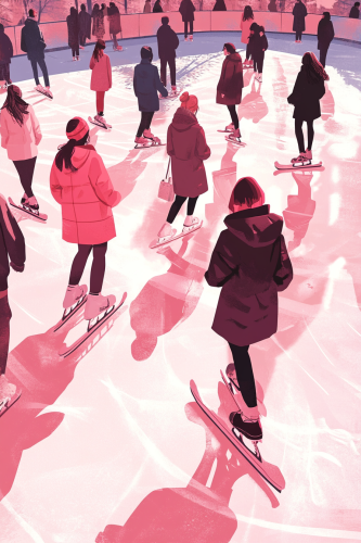 an art deco poster of The ice skating rink at Rockefeller Center in New york city. Use traditional art deco colors including blue, black, white, grey and gold.