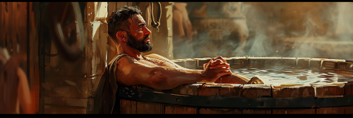 close up 40 y.o handsome medieval male relaxing in wooden tub in medieval spa, having a good time, smiling, handsome male with short black hair a with blaxk elegant beard, face like serkan cayoglu, looks like serkan cayoglu,steam, spa, professional, detailed scene illustration ,golden hour, digital art painting, hyperrealistic, chiaroscuro, tenebroso, dark, dramatic, scene illustration, digital art painting, hyperrealistic, on witcher 3 style --ar 3:1 --v 6.0
