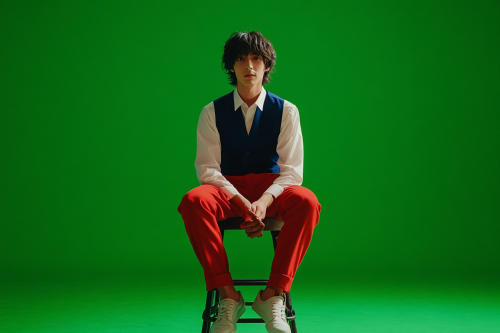 A young Japanese male in his twenties, wearing a white shirt, navy blue vest, and red trousers, sitting on an iron stool, facing the camera head-on with both feet visible. He has a fresh and approachable expression, on a solid green screen background. Full-body shot using Canon EOS R5 cameras, hd quality, natural look --ar 128:85 --v 6.1