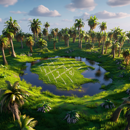 large round football field, green swamp in center, covered in short green grass, Everglades, palm trees, oak trees with spanish moss, early evening, rendered in style of fortnite